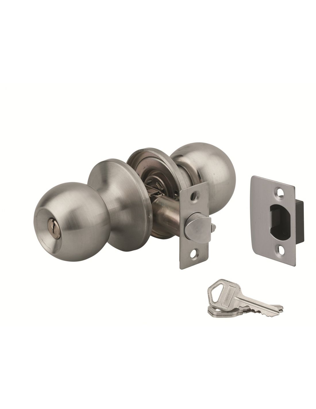 Butuc exterior din oțel presat cu cilindru de siguranță cu pini. Butuc interior din oțel presat cu dublă intrare pentru chei. Bolt rotativ de 1/2 tur reversibil cu dispozitiv de siguranță și platbandă dreptunghiulară. Placă de închidere plată. Ax reglabil 60/70 mm. 3 chei din oțel nichelat.