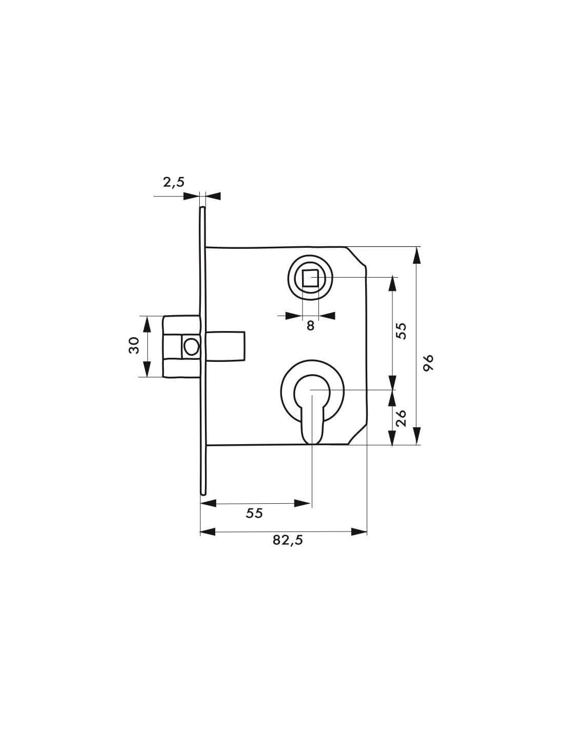 Carcasă din oțel ambutisat. Placă frontală din oțel, cu margini rotunjite. Reversibilă. Bolț din aliaj zincat. Contraplacă din oțel, de tip echer la 90 de grade. Pătrat 8 mm. Ax 55 mm. Interax 55 mm. Include cilindru profil european cu 3 chei.