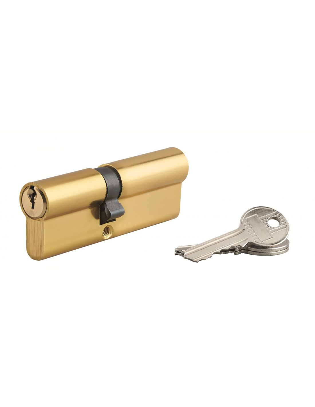 Cilindru profil european din aluminiu, finisaj alamă. Mecanism cu 5 pini. Camă anti-smulgere. 3 chei din oțel.