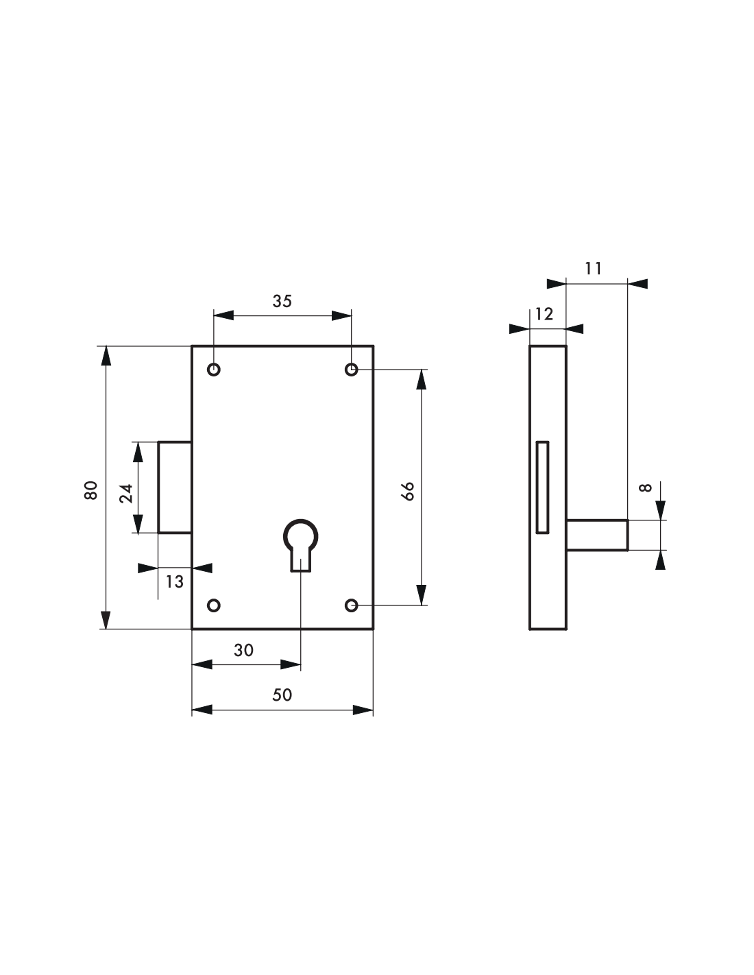 Sertar și bolt din oțel. Mecanism cu 2 rotații. Montaj pe partea dreaptă. 1 cheie placată cu alamă antichizată. Pentru uși de mobilier.